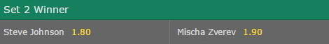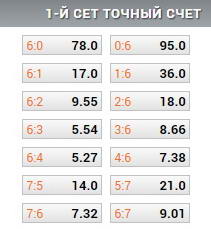 Это наиболее простая и популярная форма ставок на теннис. Ниже представлен пример букмекерского коэффициента на несколько игр.