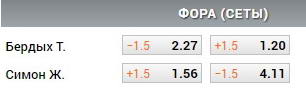 Если вы сделаете ставку на Симона +1,5 с коэффициентом 1,56, это означает что вы выиграете в случае, если спортсмен не проиграет более одного сета. И наоборот, при ставке -1,5 с коэффициентом 4,11, необходимо, чтобы Симон победил со счетом 2:0.