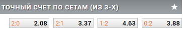 В случае верно предсказанного исхода матча, вы выиграете. Обратите внимание, что ставка 2:0 соответствует форе -1,5 с коэффициентом 2,27 на Бердыха.