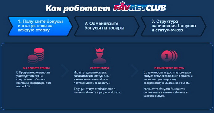Для активных клиентов разработана специальная программа лояльности, называемая Favbet Club. За каждое заключенное пари даются очки, которые впоследствии можно потратить в магазине с широким ассортиментом товаров: от фирменных кружек до тура в Лас-Вегас.