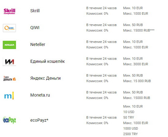 Вариантов для снятия средств гораздо меньше, но все равно есть из чего выбирать: VISA, MasterCard, Skrill, QIWI, Neteller, ecoPayz, Moneta.ru, Единый Кошелек и Яндекс Деньги.